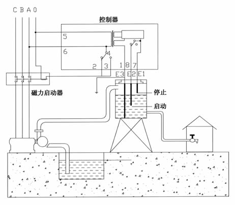 控制器的八腳插頭⑤、⑥ 接220VAC電源上,⑦、⑧、①插腳分別接傳感器電極E1、E2、E3、②、③、④插腳在直繼電器一 組輸出觸點上。
